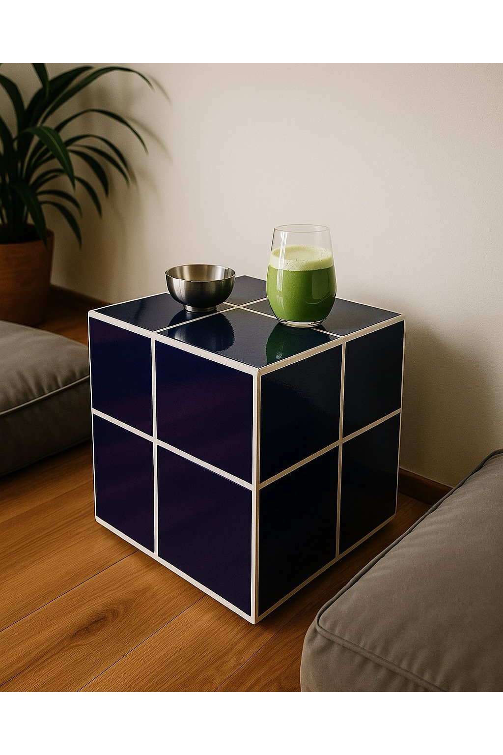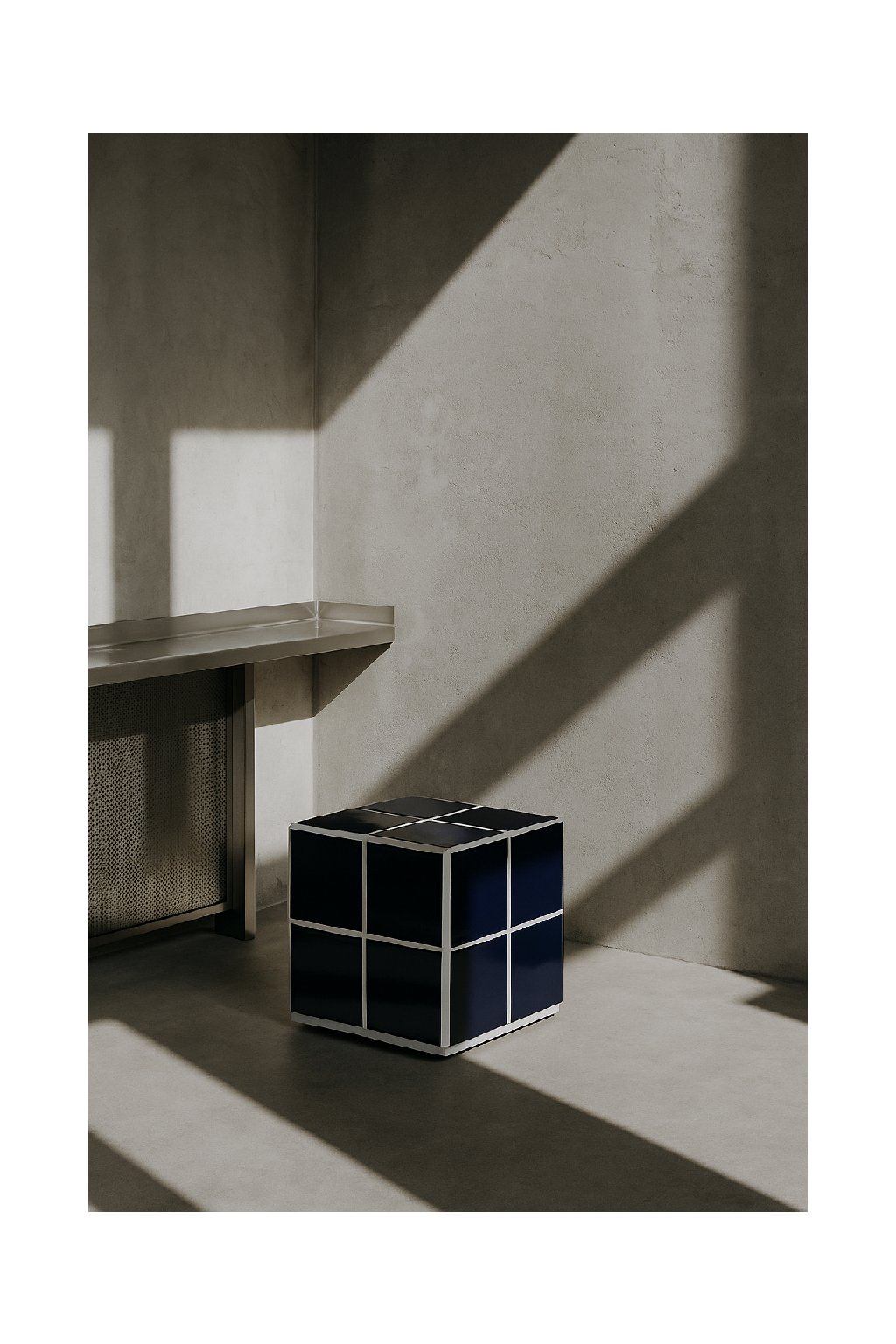 Kubus v kobaltově modrém odstínu s dokonalými liniemi a ručním obkladem, který vnese do interiéru sofistikovanou energii. Funguje jako stolek, podstavec pro umělecký objekt nebo solitér, který promění každý kout.
